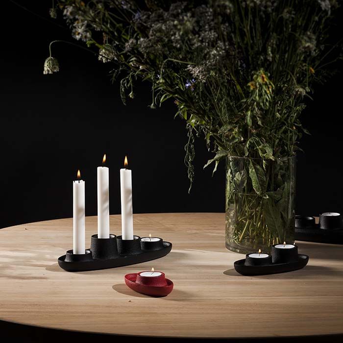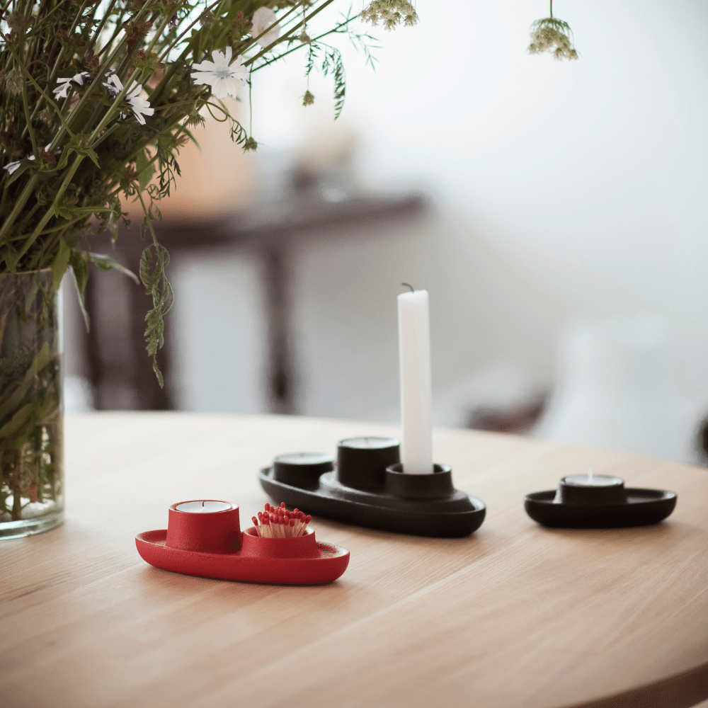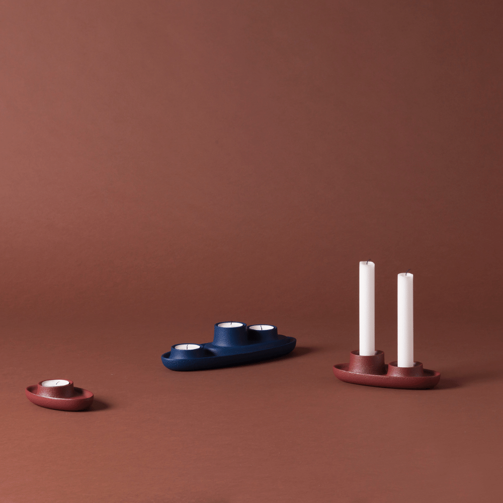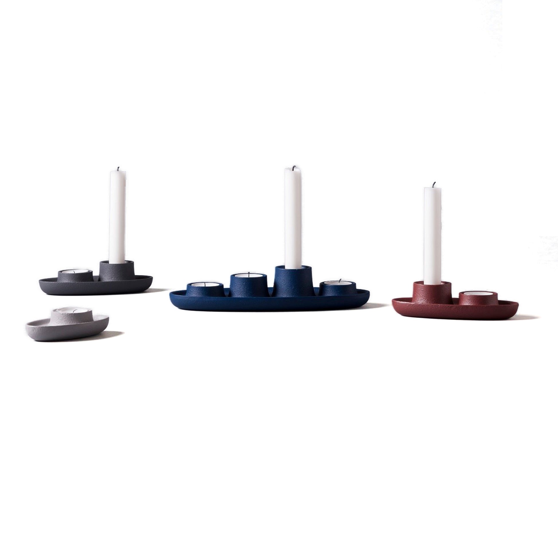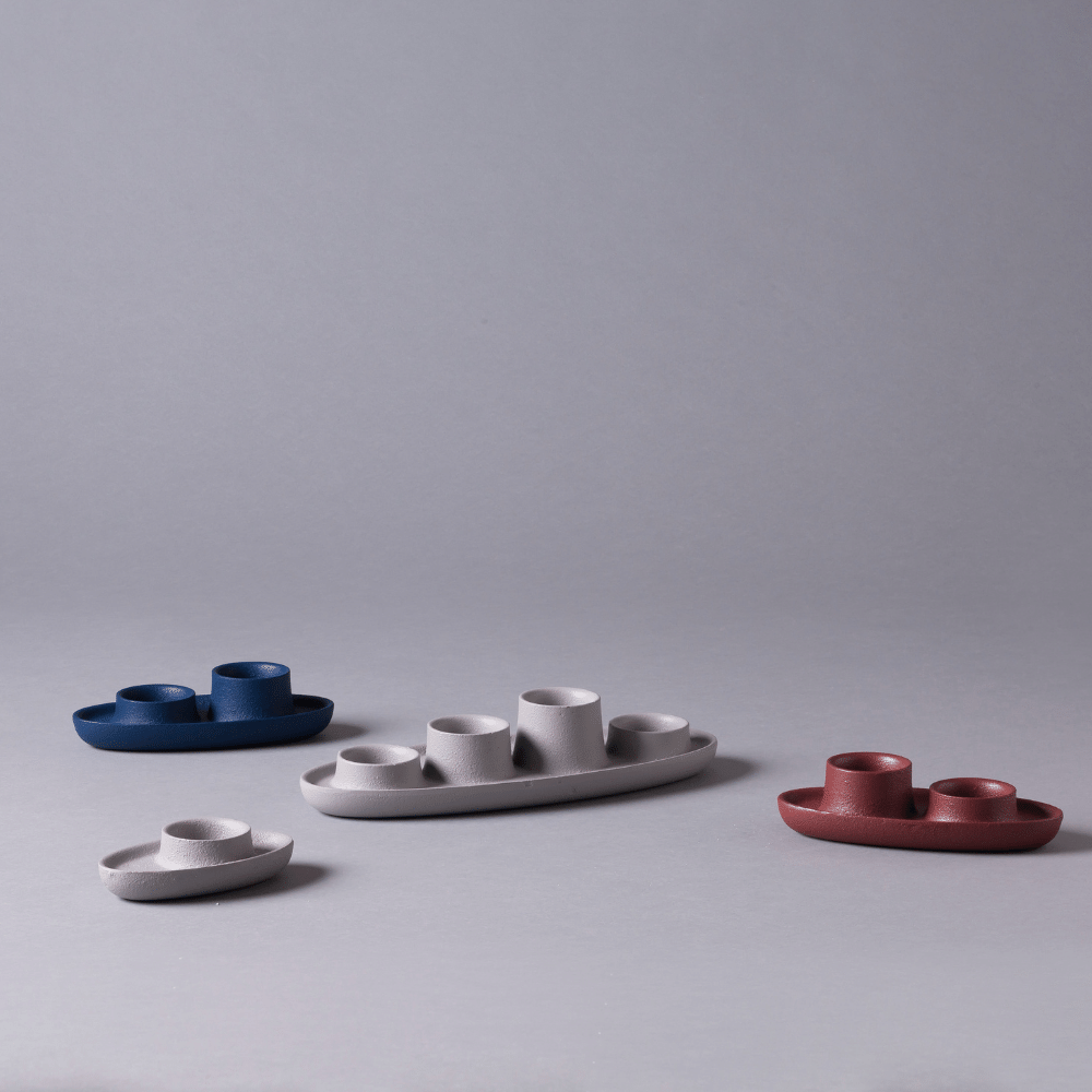 Aye Aye! is a family of rugged, round, and bold cast iron candleholders inspired by the era of adventure and discovery. It harks back to the enthusiasm of the Industrial Revolution, which unveiled the world to travelers and fortune seekers. The fleet consists of four sizes – from a small tugboat with one funnel to a hefty steamship with four big ones. All navy-themed colors are available: red, blue, black, and grey. Each funnel is designed to accommodate either a tea-light candle for cozy harbor lighting or a taper candle as a pillar of steam. Aye Aye! vessels can be combined in any size and number to create various themes, easily adjustable to different events and backgrounds.