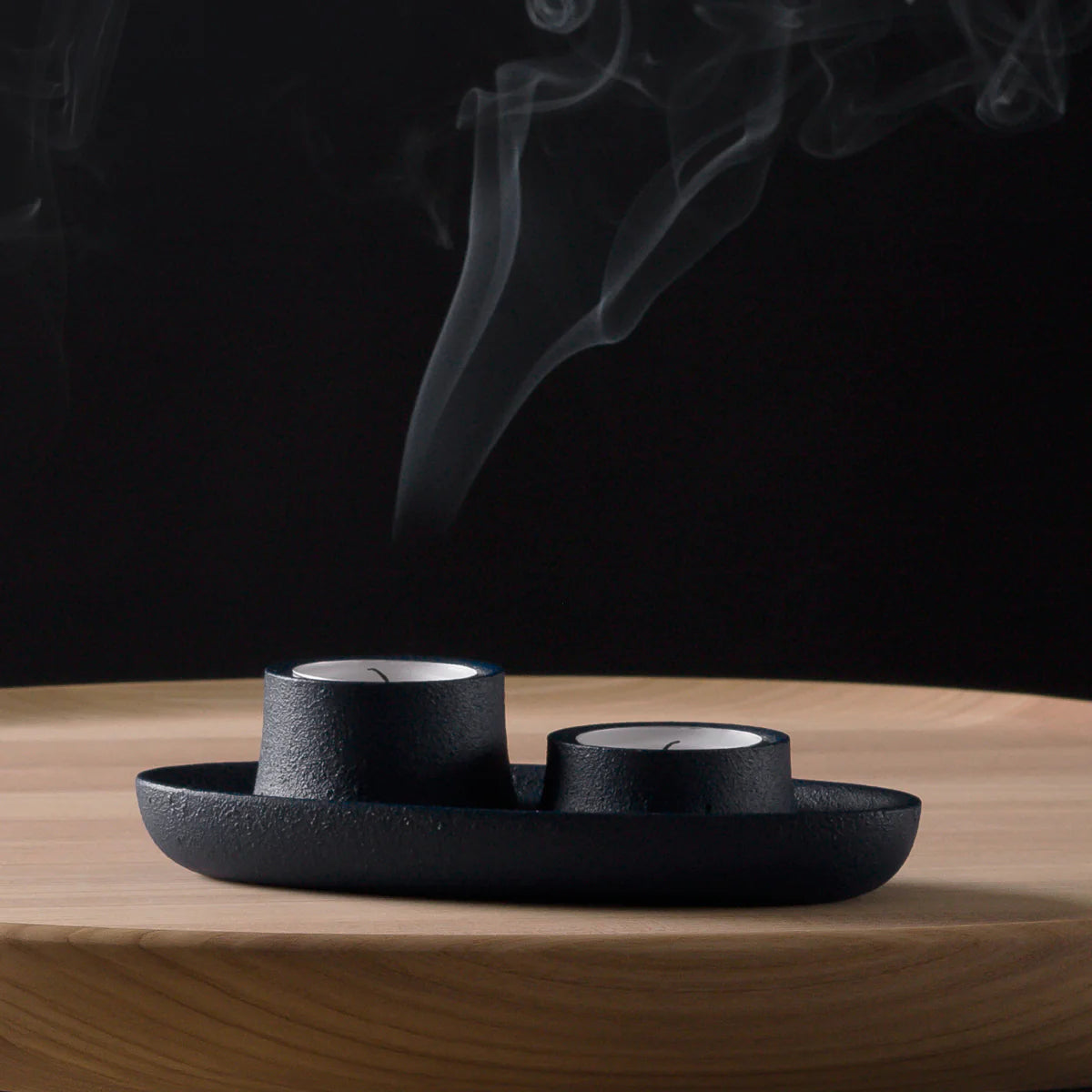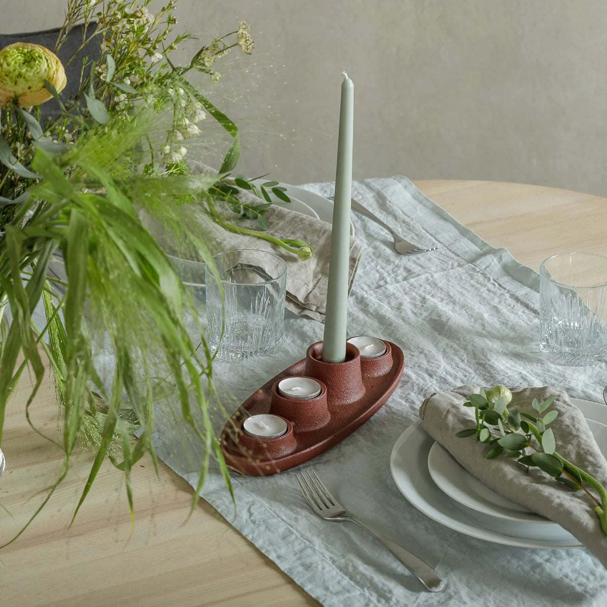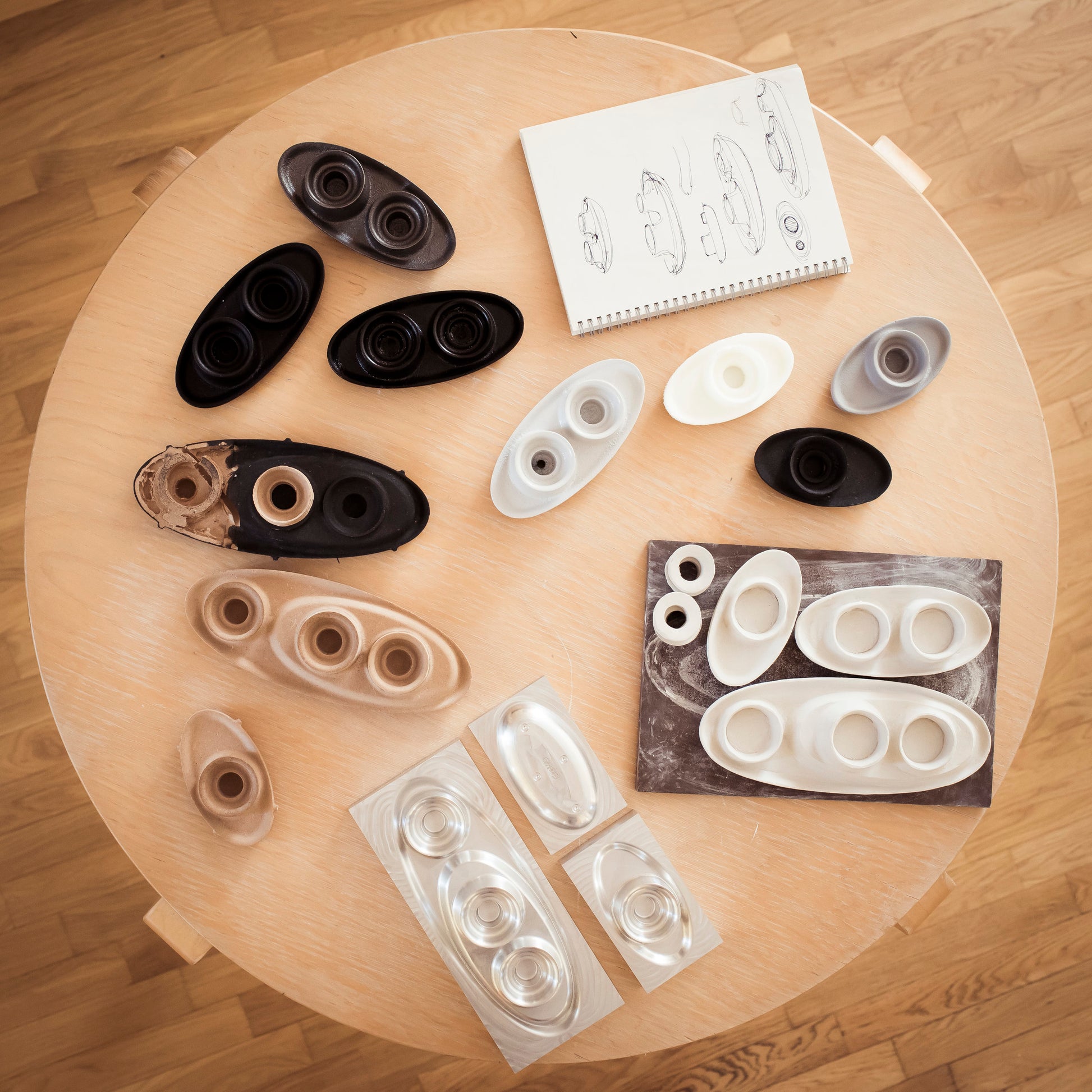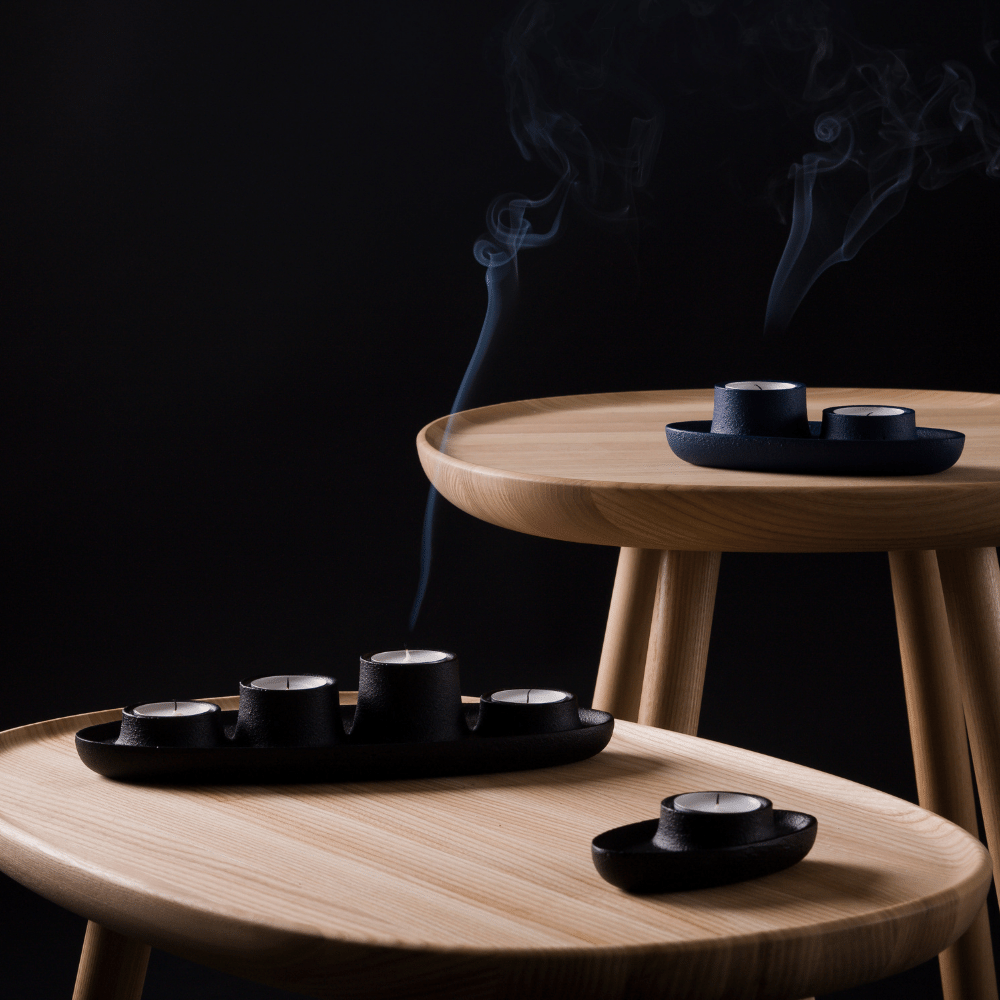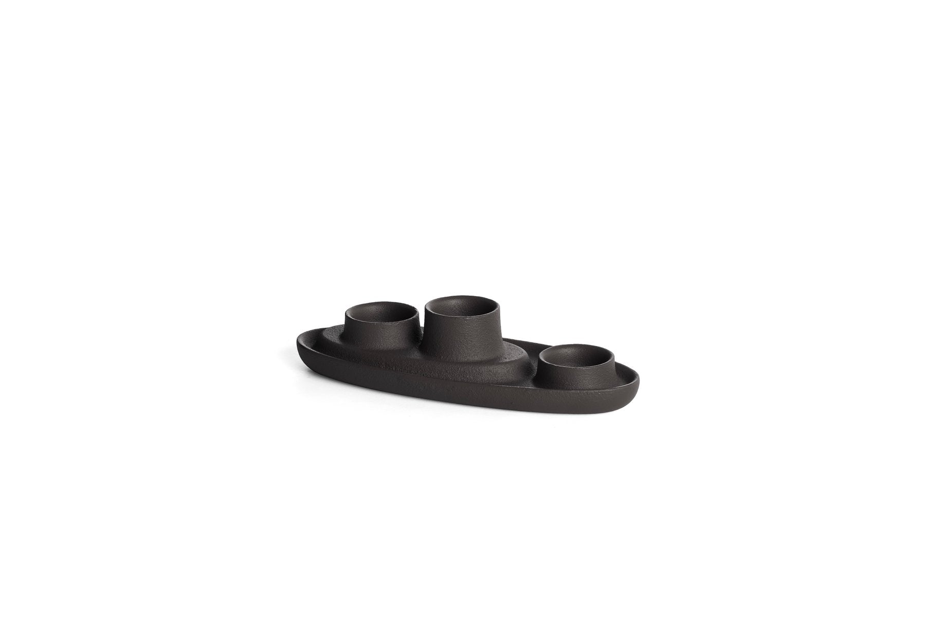 Aye Aye! is a family of rugged, round, and bold cast iron candleholders inspired by the era of adventure and discovery. It harks back to the enthusiasm of the Industrial Revolution, which unveiled the world to travelers and fortune seekers. The fleet consists of four sizes – from a small tugboat with one funnel to a hefty steamship with four big ones. All navy-themed colors are available: red, blue, black, and grey. Each funnel is designed to accommodate either a tea-light candle for cozy harbor lighting or a taper candle as a pillar of steam. Aye Aye! vessels can be combined in any size and number to create various themes, easily adjustable to different events and backgrounds.