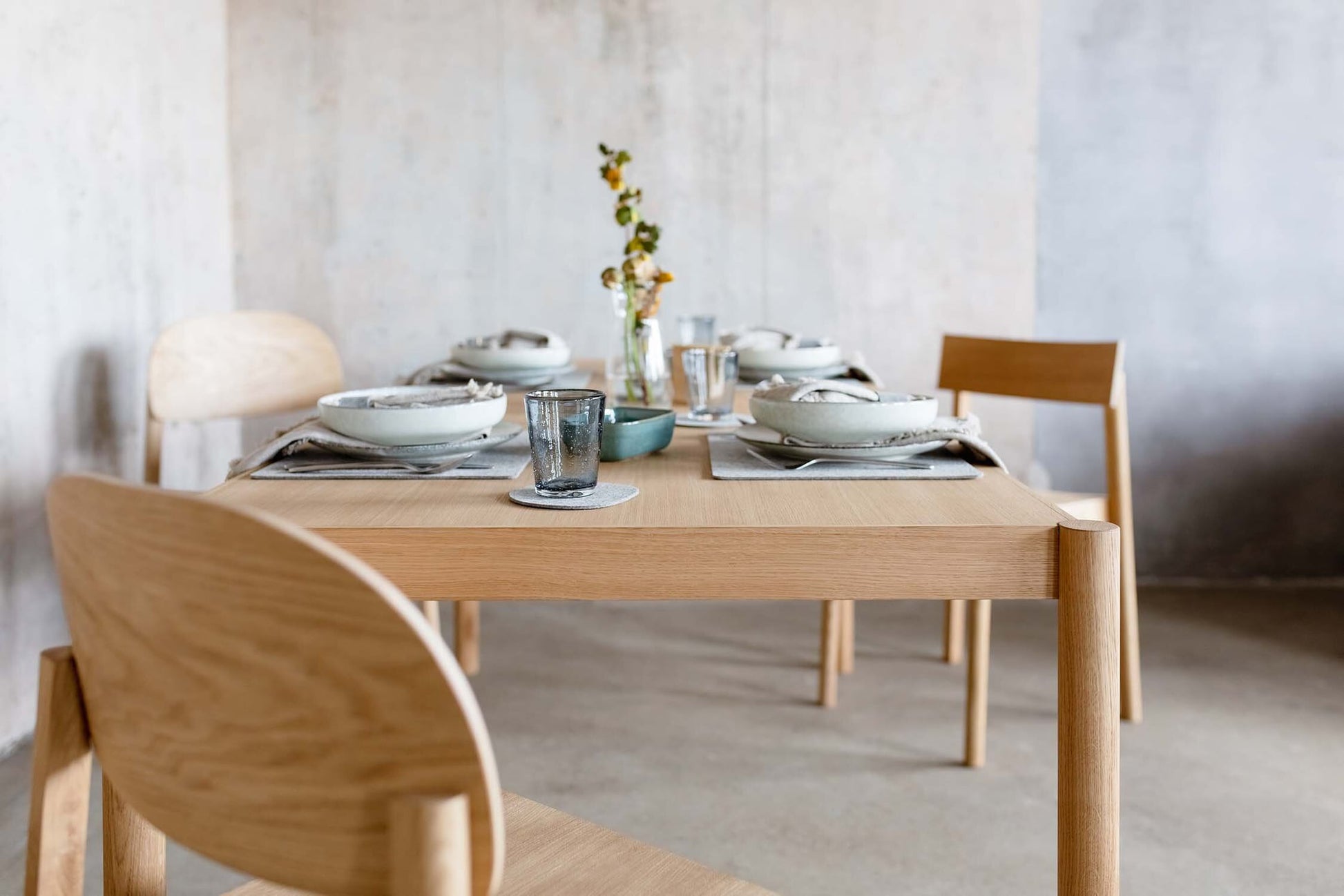 Moreover, the table is crafted from sustainable, natural materials — solid oak and veneered plywood — and perfectly matches our stackable laconic Citizen dining chair.