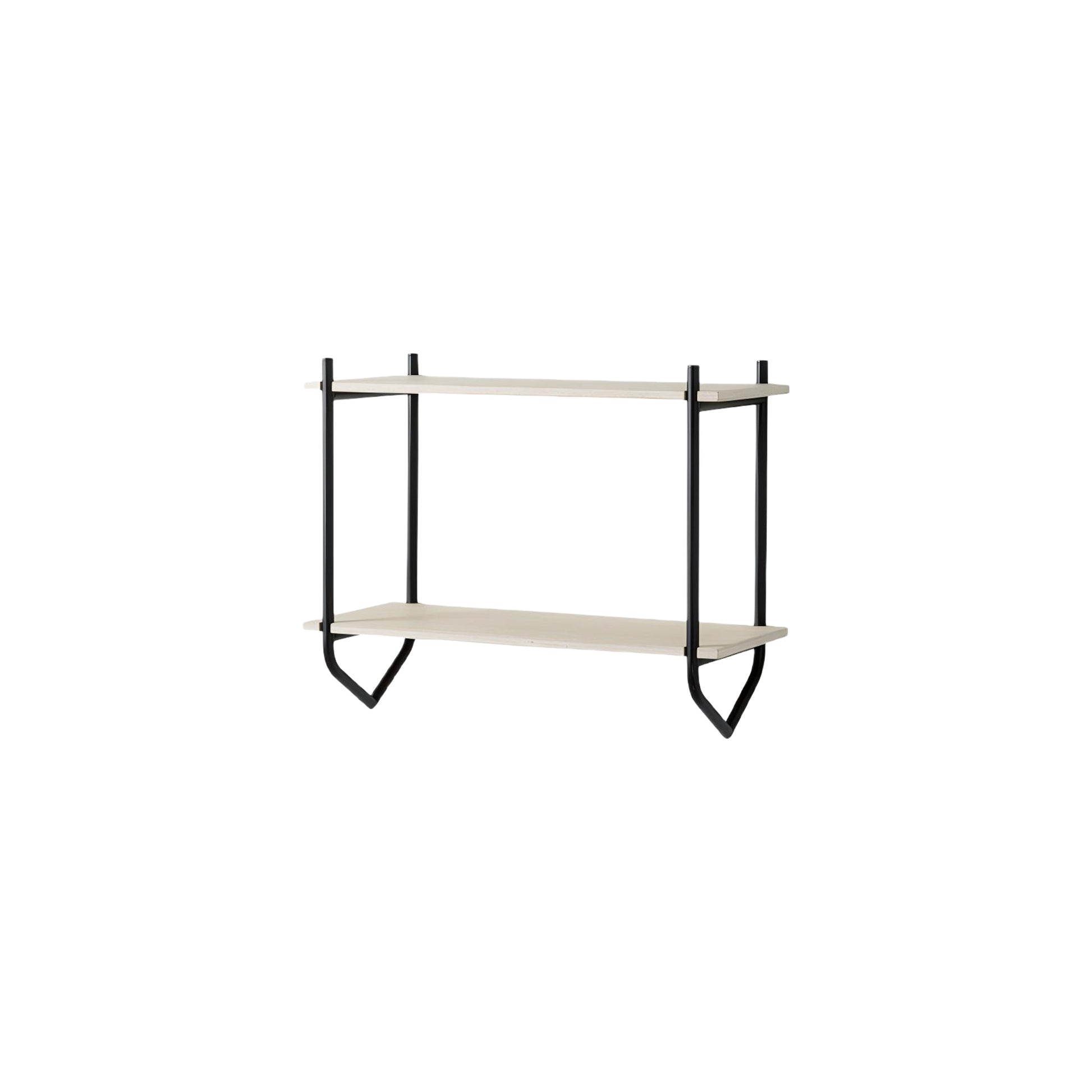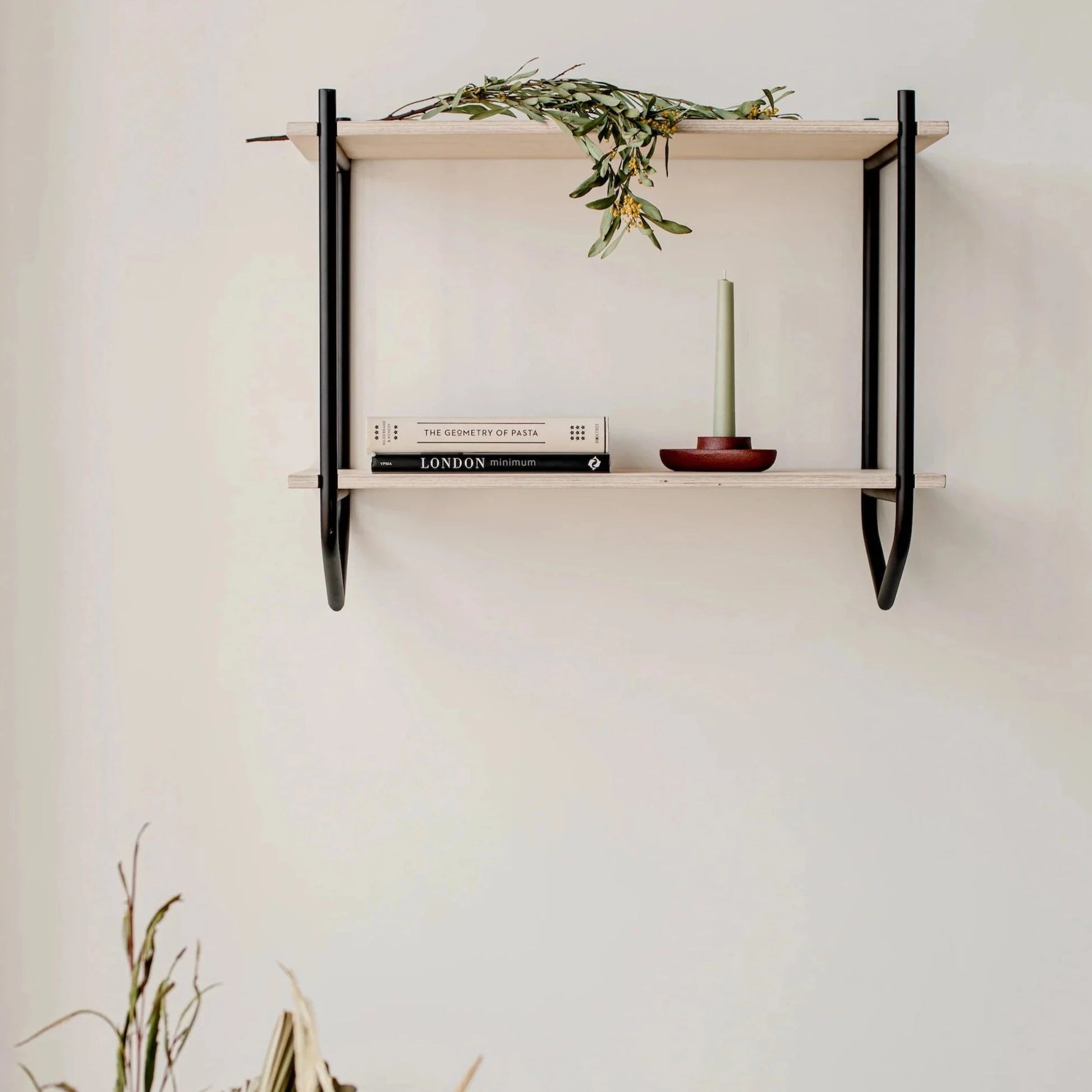 In French, the name of this wall shelf means on top of and describes its primary function — to store your books, tableware, or decoration on top of the shelves. Dessus is a double-deck wall shelf. Powder-painted metal and plywood here accompany each other and connect into a timeless piece. Moreover, this shelf comes in a flatpack. Its two arch metal frames and two birch plywood shelves are easy to assemble and fix on the wall.