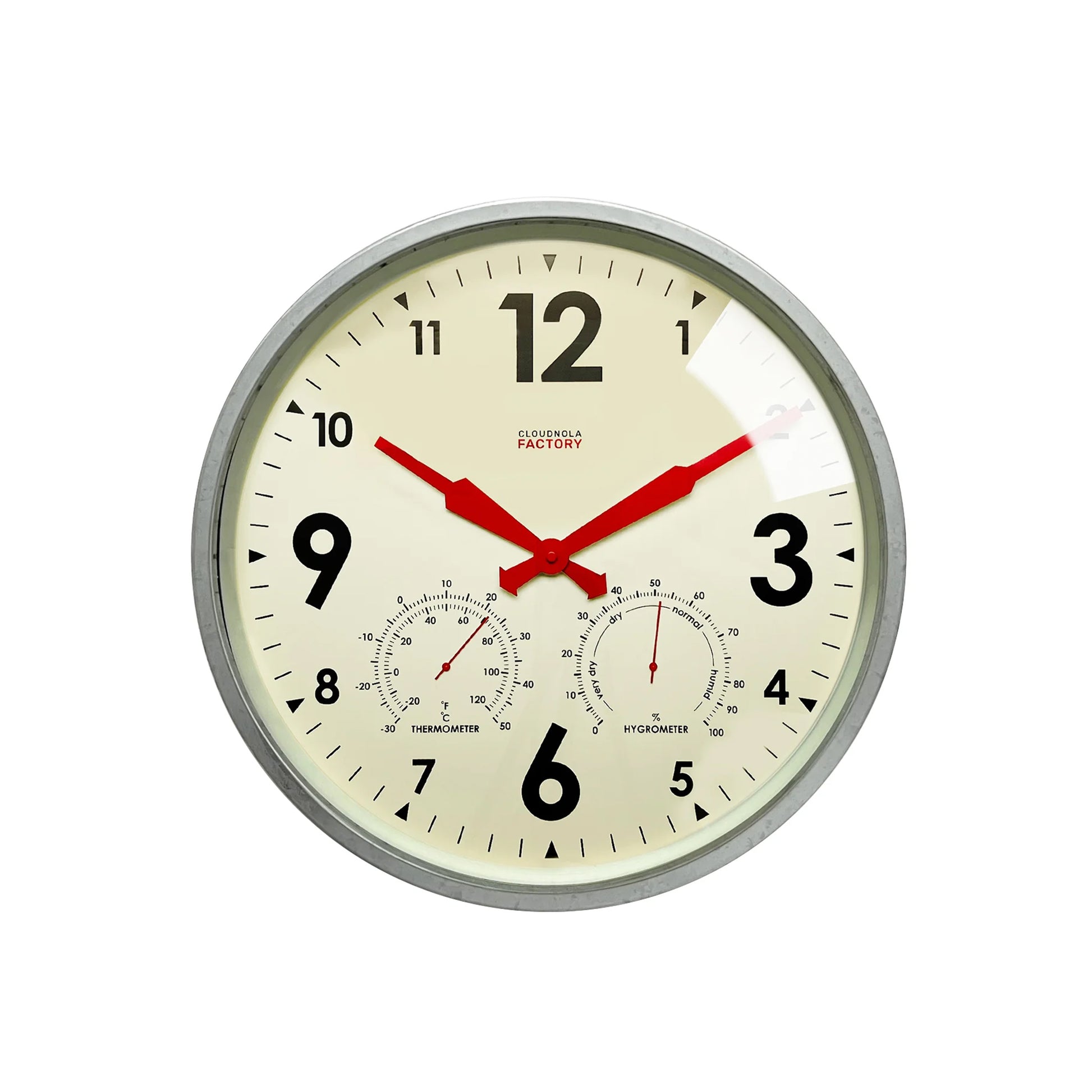The clear, legible face of the Factory Outdoor Zinc Wall Clock ensures that time, temperature, and atmospheric pressure are easily readable from a distance. Its design marries the ruggedness needed for outdoor durability with the sleek style that complements any exterior décor theme.