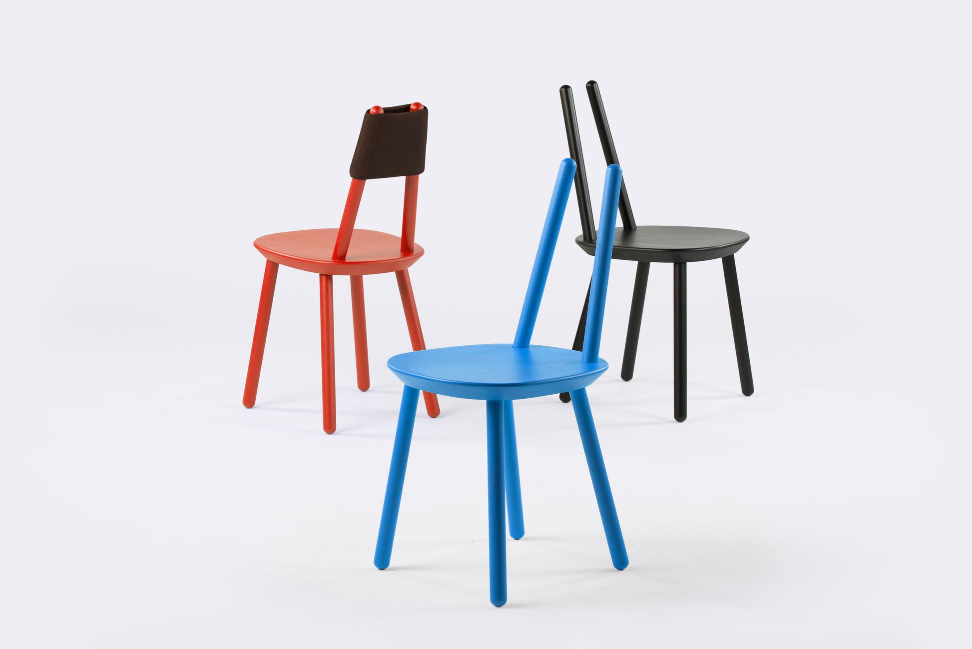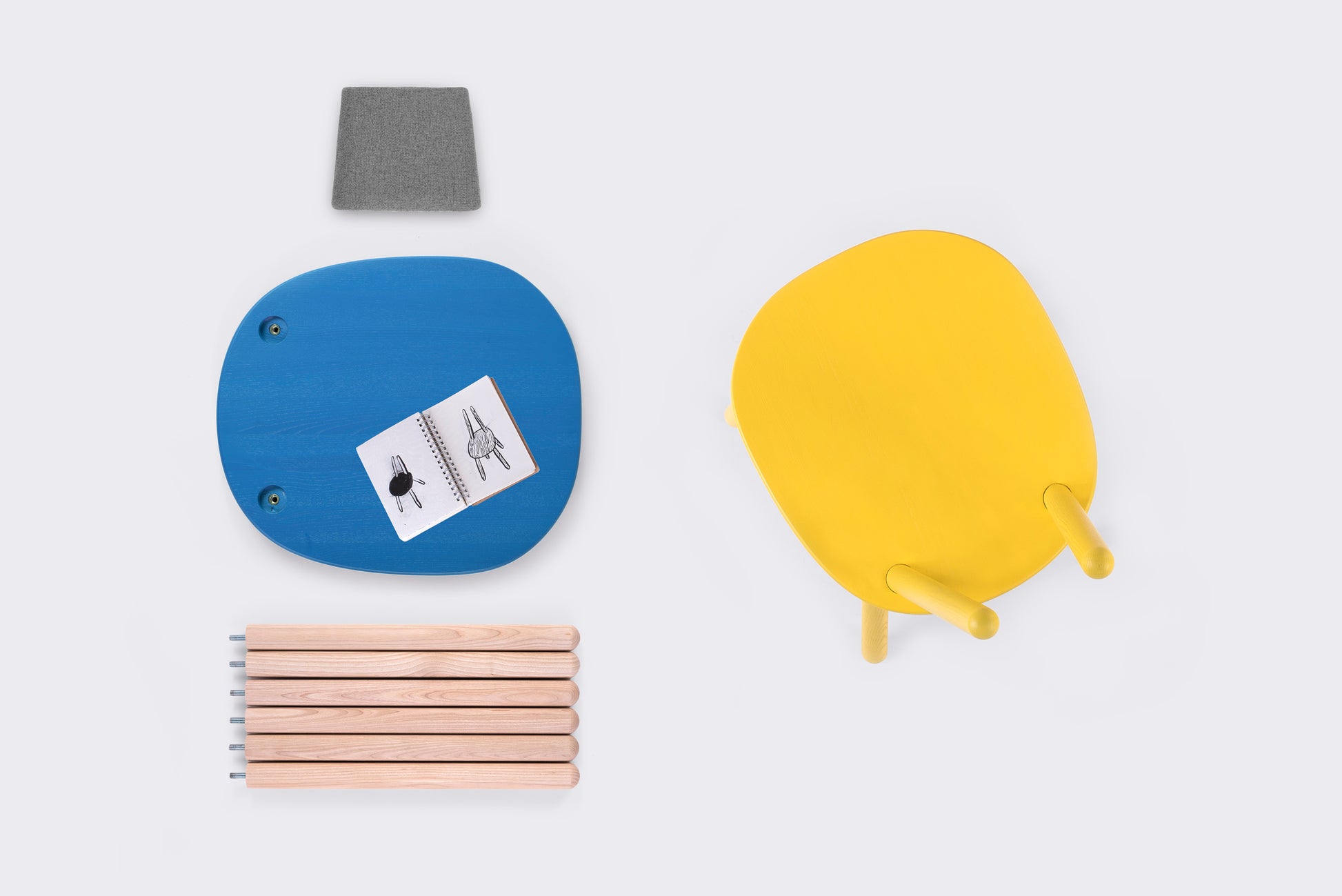 This playful chair is stripped to the minimum: a carved solid ash seat and six legs of equal length to screw. It takes pitch-perfect accuracy to design its simple looks. Every single detail is carefully studied, the length and angles of the legs are engineered to obtain the best proportions and to offer superior ergonomics and a great sitting position. All this and the added flexible foam backrest make NAÏVE a surprisingly comfortable chair. It takes a minute to assemble it, and another one to flat-pack it back into a small box for transportation or shipping. As an extra feature, the easily interchangeable parts enable the user to play with the chair’s color palette, from classical solid wood to a mix of joyful tones.