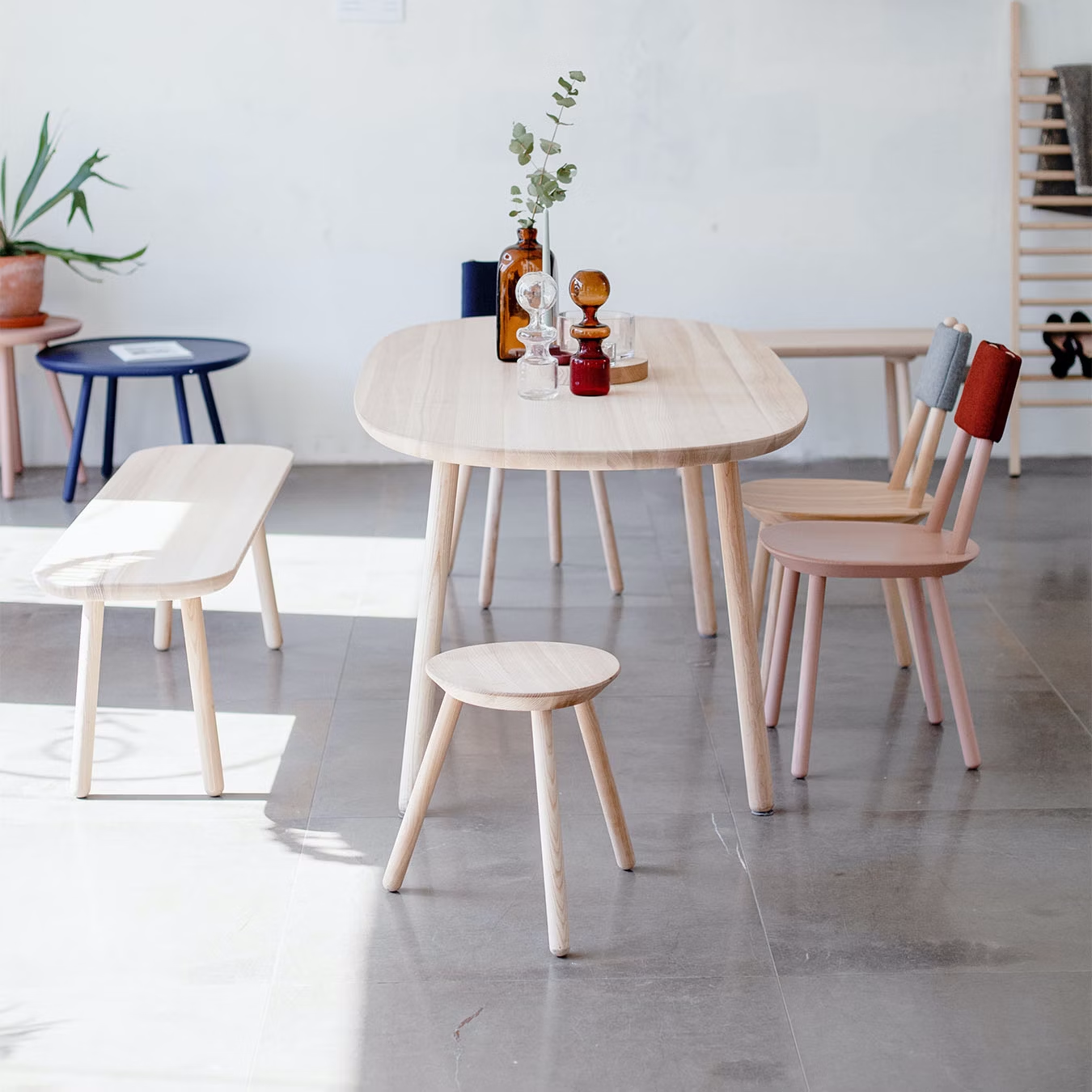 Table's modest and clean form is decided by a simple but lasting construction - each leg has its own base under the tabletop making the table strong enough to serve generations to come. The roundish tabletop contour is designed to create an inviting and cosy atmosphere for everyone sitting around it. The table is available fully oiled or with a coloured body revealing just the oiled ash tabletop surface.